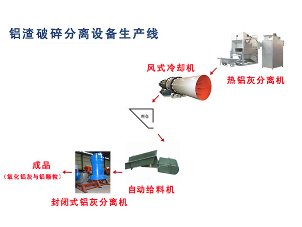 單獨(dú)的熱鋁灰轉(zhuǎn)化冷鋁灰分離生產(chǎn)線:熱鋁灰→→風(fēng)式冷卻機(jī)→→料倉→→自動(dòng)給料機(jī)→→封閉式鋁灰分離機(jī)→→成品(氧化鋁灰與鋁顆粒)